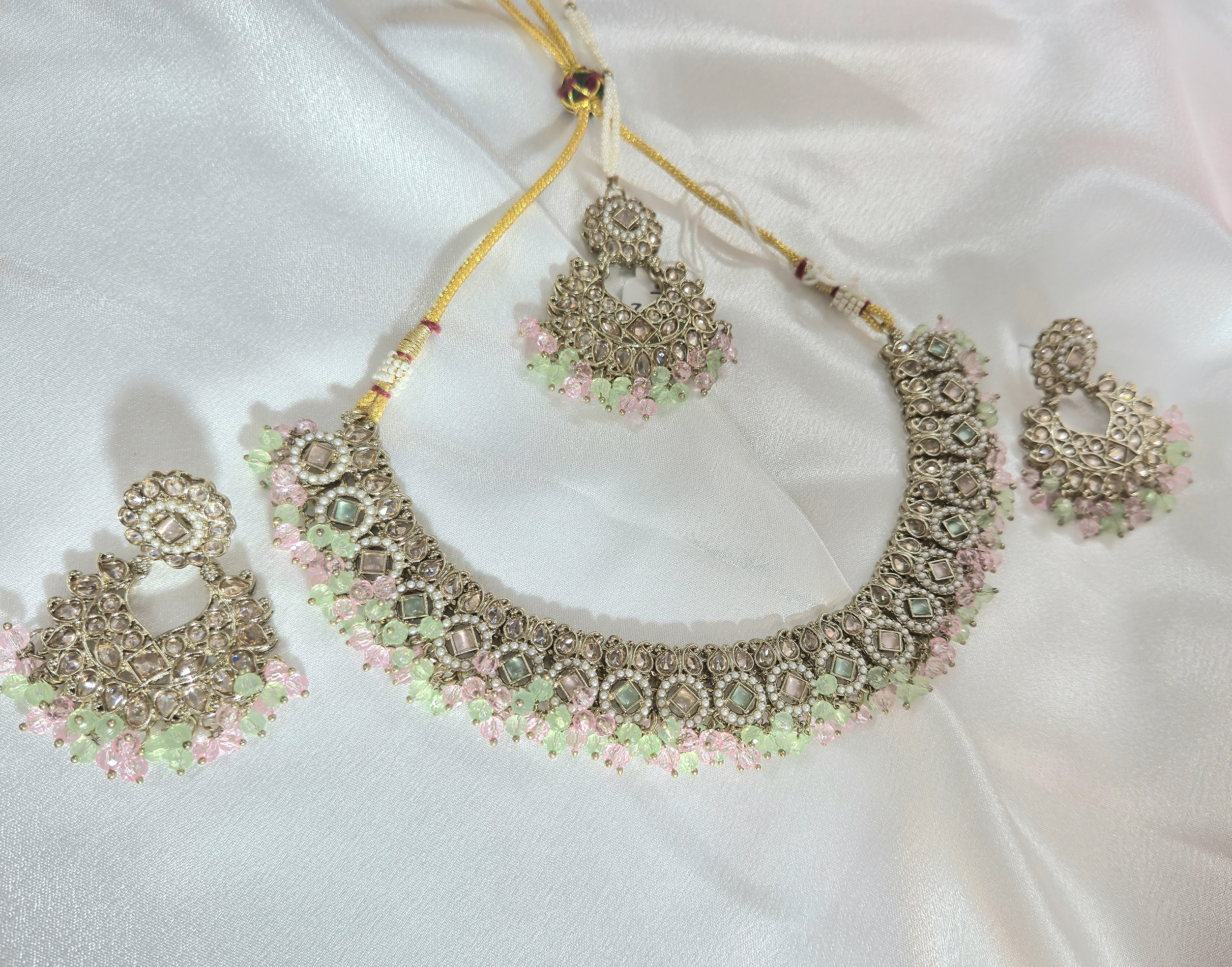 Kundan-style necklace with pastel mint and baby pink bead bunches. Comes with matching heavy earrings & tikka. Soft, elegant colours—perfect for modern ethnic looks and day events.